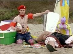 Tommy is trying out for a karate commercial and the other five Rangers are going to the beach.