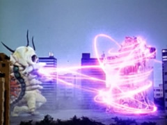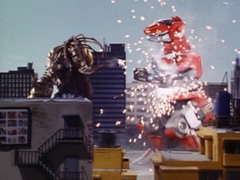 Tyrannosaurus is pinned down. The other zords zap Scorpina and Goldar off.