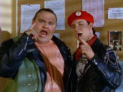 Skull gets squirted with soda, Kim laughs and he tries to spray her but sprays Bulk. Bulk throws pie at him. |