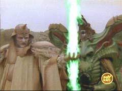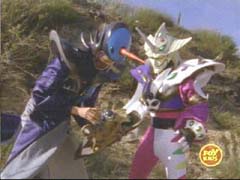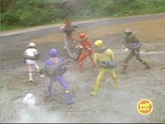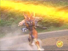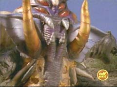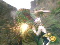 | The Rangers call on the Wild Force Megazord Striker mode to help out. |