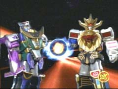 Thetwo Megazords join fists and deliver a mega sized blast. |