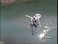 | Alyssa morphs and zips Merrick out of harm's way, and into the water. |