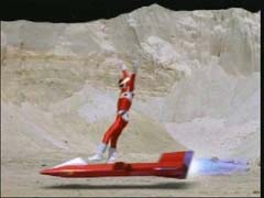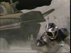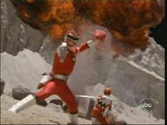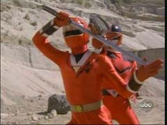 They are being spied on by Andros, the Red Space Ranger, sporting his signature cloak. |