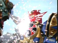 The Megazord reverts back to normal, and finishes off Copybot with the Serpent Sword. |