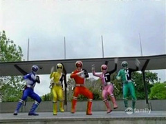 The Power Rangers use the Canine Cannon to bring down their target. |