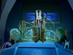 The Rangers form the Delta Squad Megazord to deal with the giant alien. |