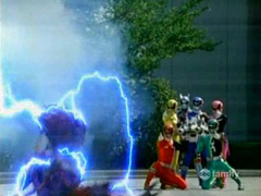 Sky is about to destroy Wootox, but sacrificing his body to do so, but the other Rangers stop him and turn their weapons on Sky. |