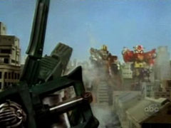 In the present, all three generals are with the attackbot attack. The Rangers arrive and fight the Grinders. They then morph and Ziggy mentions the run-off explosion behind him. |