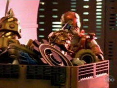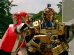| After the break, Kilobyte faces the four Rangers left. He takes them all down. Bob wants Ziggy, Tenaya brings her gun up, saying he is valuable to them. Ziggy fights the Grinders and Tenaya and gets his morpher back, he morphs and tells the gangsters to run. The Rail Saber is finished. Dr. K detects Green. She tells Gema to help "Zig-- Ranger Green." The gangsters leave in the limo. Tenaya fights Green. Gold arrives with the Rail Saber to save the four. Gold loads the cells 11 and 12 (T-rex and Triceratops) into the saber and fights Kilobyte. Kilobyte goes down. Green and Ziggy fight. Silver flies in, literally and they both fight Tenaya. Gold gives the saber to Red, he puts the mamoth cell into his gun and makes the Rail Blaster by combining the two and take down Kilobyte. Kilobyte says begin the download and becomes big. PaleoMax is formed and the other zords attack Kilobyte. Silver and Green fight Tenaya but go down. Tenaya picks them both up and drops them down. The Grinder and Tenaya leave. ValveMax is formed with Gold zord as an arm and HighOctane fights Kilobyte. K has detected charges around the city. The Grinders are about to detonate it when Mach Megazord arrives with Ziggy's zord as an arm. Road Attack Zord is deployed. The five robots kick Kilobyte down. Kilobyte attacks them and out of the blaze, the 12 zords comes towards him and form the Ultrazord. They destroy him, he says it isn't over yet. Back at the evil lair, Kilobyte comes in damaged and moaning. Tenaya brings in the case. Venjix says the final strike is coming up. Back at the garage, Ziggy is packing and moving out, scared. The others try to convince not to leave. Fresno Bob comes in and his men grab Ziggy. He says when he saved his life, he figured he is 'all right' and they are now even. Ziggy is thrilled. He calls him 'bobarino' and Bob tells him not to push his luck. |