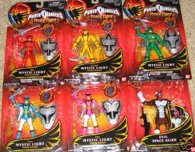 | * [25001-25005, 25007] Mystic Light Power Rangers - Red, Yellow, Green, Blue, and Pink. Each Ranger comes with their morpher, Magi Staff and their shield with their symbol lights up. The Hidiac is referred to as 'Evil Space Alien', a default name Bandai America places to a villian when the name has not been turned in yet. Does not necessarily mean the villian is a space alien. The figure comes with removable mask that shows guts. |