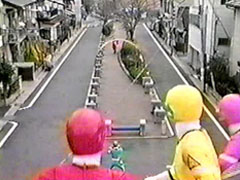 | and Natsumi stands in the way. She falls down. He races away with her. LL Onene captures three girls and they join her biker gang. Naoki and the girls then terrorize a local market place. The Carranger then | arrive in their Speeder Machines. Red Racer presses a button for the red light to turn on, it does, but they run past it. The Carranger try stopping them, the Bike Gang runs past them. The gang has gotten larger. |