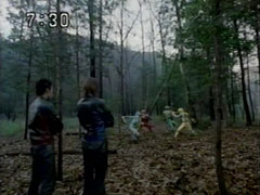 | But he only shoves herout of the way. He has brought back the filled pack. Furabijo rushes to Wendinu's side. Tao Zanto is most pleased with what he's got. The five stand near the shore. Yousuke gives a quick speech over the Shuriken Ball. | They are glad to go together to make sure Shurikenger's death means something. They transform and jump in the Hurricane Hawk. They on their way out to the Centipede. It is time to take the battle to them. For Shurikenger. |