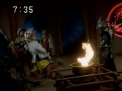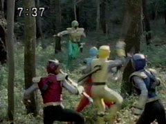 | The message makes it that anything can grow to enormous proportions. The heroes are told that Tao Zanto is creating a black hole. Satorakura starts sucking the power from the weapon and this upsets Tao Zanto because he wantedthe energy for himself. | Saandaru teleports down. Satorakura multiples himself and fights each hero. All six are regroup and he is one. He blasts them out of their armors. He zaps them all, taking their energy. They all faint. Satorakura's energy is full on his pack. |