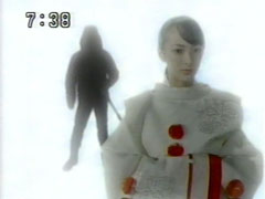 | Saandaru arrives and Satorakura goes to him. Shurikenger thinks back to when Saandaru killed Gozen. Saandaru strikes the backpack off Satorakura. When he whines that he wasn't done using this yet, suddenly Sandarusplits his maskin half | and he screams and falls face first. Saandaru laughs. Shurikenger gets up and kicks him down. They battle it out and Shruikenger takes his grief out about Gozen. He is knocked down. He makes a fist and gets up again. He goes to fire mode. |