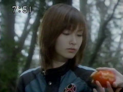 | Gozen's blade is also on a shrine. The students are to rgaduate but not present. He grabs their diplomas and go. Outside, by the waterfall, the trio are rather sad. Yousuke tosses a persimmon to them like in the first episode and they each take a | bite. Nanami says she misses them. The Goraijer arrive an say they will eb finish. Isshuu says they will have real ninja work now. They talk about what they will fight for, protecting the world. The five put their hands together. |