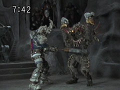 | Vankyuria arrives and teases them. They transform and Red does the first kick and gets the first punch down. Green tries kicking and gets his foot hurt. The others get beat up. Nai and Mea tease them. Tsubasa is really mad. They ring the bell. | Tsubasa says he was top in the national boxing team in High School and dodges Ghoul's punching successfully. Just when you think he is gonna win, Nai and Mea intervene with their own little special attack with their puppet and purse. |
