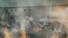 | She then shoots him with her Hyrdro Shooter and Survibuster. Then the others kick him down. She dons the Accelltector and calls the Dual Crasher. She destroys him and Yellow is happy. | The Prince grows huge. Pink calls the GoGo Vehicles and form DaiBouken. They slash at him but miss and he figth sthem. SirenBuilder approaches. |