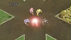 | Pink pulls out the Precious and calls the other GoGoVehicles. She says that Orange East, Blue West, South Green and Indigo North, he has the worst Feng Shui. | She hands the Precious to Red and he amplifies the Precious' power using the Parallel Engines. They give him bad luck. |