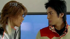 | Kashi collapses again, stands up, and collapses over and over again. Natsuki then puts her lucky hat on his head and covers him with the jacket. She tells him if he wears those things, his luck will go up. | Masumi says it is probably a psyhcological effect, but he has nothing to loose. Akashi is touched, saying he can't stay and be depressed. He is Bouken Red and won't lose to fortune telling! |
