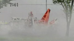 | Akashi slips on a can and falls. Just then a construction crane breaks off and falls on top of him. Luckily he transformed into Bouken Red. He leaps out. As he reaches the ground, he slips on a small cylinder. | As he tries to recover, he gets hit by a truck and flung onto a building and rubs his head. He sees the Jaryuu come out of the building and he tries to follow them but trips on a pole and falls down. He rubs his lower leg. |