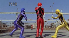 | GekiRed faces off against the Five Venom Fists and Rio. Rio uses his Black Lion aginst him. | He de-transforms into Jan and the other Five Venom Fists (in their Rinrinshi forms) have their licks on him. Then Kademu comes around and beats him up. |