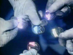 | As Zordon instructed, the Power Rangers combine their Power Coins into one so that the Blue Ranger can hold the power of the entire team. |