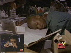 | Damon falls asleep after an all nighter working on his plans. Baxter sneaks in and takes pictures of the blueprints. |