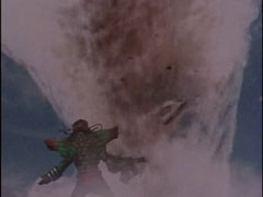 Her memories of Alex make her go looney, and she sets her blaster to destroy. The Rangers struggle with her to hold her fire. |