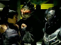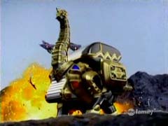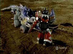 Zeltrax launches the Terra Assault Vehicle against the Thundersaurus Megazord, and the Rangers don't stand a chance against it. |