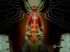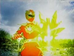 The Red Ranger morphs into the Triassic Ranger, and the Shield of Triumph begins to glow. |