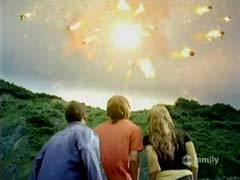 The other Rangers watch as the Aerial Assault Vehicle explodes with Tommy and Zeltrax inside. |