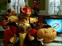 Everyone helps with the decorations and the Sentinel Knight makes a Jack-O-Latern. The Rangers run to stop the Fearcats, joined by the knight. Moltor teleports into the scene. The three combine their powers and blasts at the seven. |