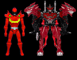 Super Charge Ranger, he uses the T-Rex Super Charge Morpher that has different modes. Comes with two Chargers (Super T-Rex and Fossil Stegazord). |