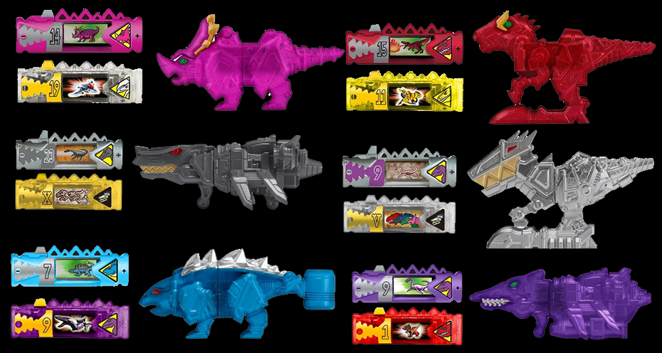 | * [43283, 4390-43295] Dino Charge Power Pack - Series 1 and 2 - Translucent Dino Cupid with All-Magenta charger and Egg #19; Translucent Dino Blaze with Egg Dino Cycle charger; Dino Clone with #23 charger and Fossil Maximum; Silver Victory T-Rex with Fossil #9 and Victory charger; Translucent Ankylozord with All-Aqua charger and Egg Plesiozord; Translucent Plesiozord with All-Purple charger and Egg T-Rex. |