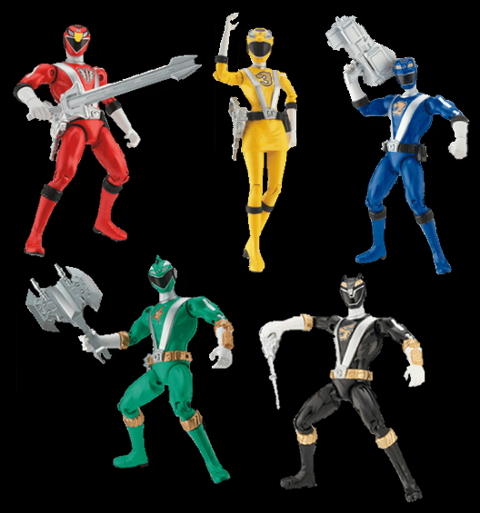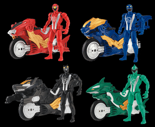 | * [31001-31005] 5" Full Throttle Power Rangers - Shark, Eagle, Wolf, Lion and Bear Rangers come with individual weapon, Nitro Blaster (both modes), morpher, miniature guardian vehicle, and miniature villain. Bear Ranger comes with the Attach Case that can launch the guardian vehicles at the villains. |