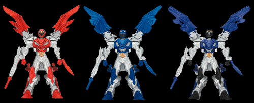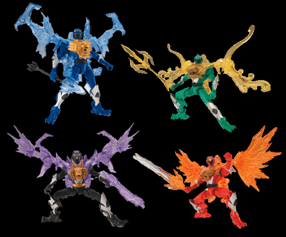 | [31031-31034] 6.5" Moto-Morph Rangers - The articulated Eagle, Lion, and Wolf Rangers have three different morphing modes. Use the included Engine Cell Key to activate their wings, morphing the zord's head, arm weapons and missile launcher. |