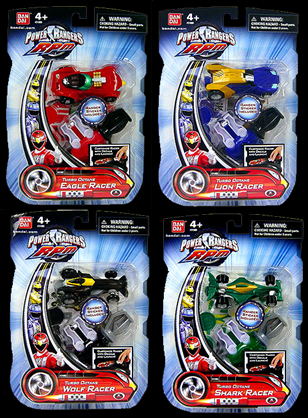 | [31051-31054] Racing Performance Cycles - Transform the cycle from Cycle Mode into Slider Mode for the Ranger to ride on top of. Select from the Eagle, Lion, Wolf, and Shark Rangers. Combined the included armored pieces to morph the cycle into a Micro Zord Animal. |