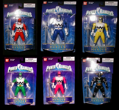 * [10621-10629] Power Rangers Heroes Series 10 - Red, Blue, Yellow, Green, Pink and Magna Defender Lost Galaxy figure. Although the original figures came with 'jet packs' and Magna Defender came with cape, these did not include those particular accessories.